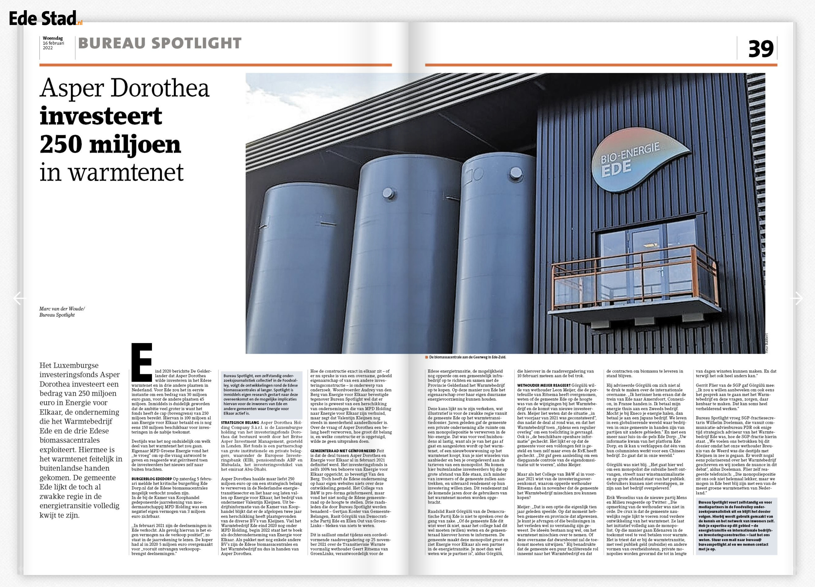 Het Luxemburgse investeringsfonds Asper Dorothea investeert een bedrag van 250 miljoen euro in Energie voor Elkaar, de onderneming die het Warmtebedrijf Ede en de drie Edese biomassacentrales exploiteert. Hiermee is het warmtenet feitelijk in buitenlandse handen gekomen. De Gemeente Ede lijkt de toch al zwakke regie in de energietransitie volledig kwijt te zijn.